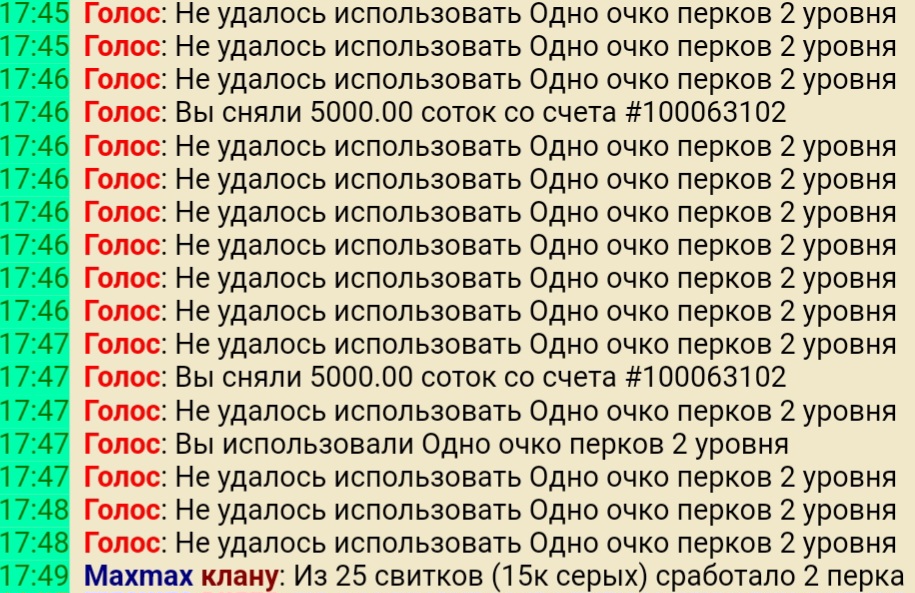 Автор этих строк хочет поделиться последними своими опытами. Чтобы добавить 10 перков клонам (смертельный и пробитие у клонов серого дамагера - вещь), потребовалось 40 свитков! (25% срабатывание). А вот сегодня удалось добавить еще 4 перка, но пришлось купить целых 30 свитков! (13% срабатывание) Дальше лудоманство пришлось прекратить, т.к. серых соток не осталось, а профессия банкира на Арене давно закрыта. Вот как это выглядело (часть лога):