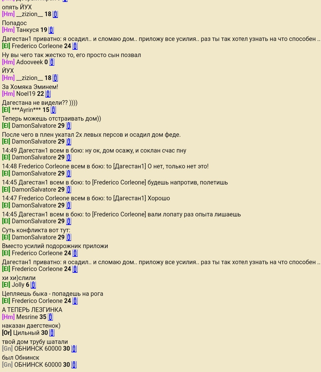 3) 17 марта (вт) Даг переключается с режима "меня обижают, я с вами не играю" на режим "я сам кого хочешь обижу". И в этот день происходит достаточно много событий. Для начала, между 12 и 13 часами в хаотах Дагестан сливает спецухи против Юриса: раз и два.