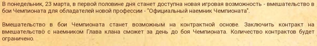 В бою чемпа теперь могут быть персы без значка! 3 штуки. Всё, зачем перезаигрывать, если можно нанять фулла на конкретный бой? Причём нужной раскачки и на нужных условиях, защищённых судом? И фуллам хорошо, можно сидеть в топ-клане, не скучать и даже зарабатывать. И проекту вроде хорошо, 500 сс свиток. И кланам вроде хорошо, не надо платить 5-10к сс за перезаигровки, да и наймы идут плюсом к численности клана.